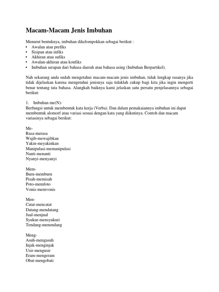 Menyusun kata imbuhan dan jenisnya merupakan hal yang tidak sukar. Kata kata yang mudah dimengerti pembaca berasal berasal dari penulis yang mengerti benar apa yang dapat dituliskan. Setidaknya itulah pelajaran sederhana yang sepanjang ini kita dapat dari pengalaman menulis. Semakin kami tahu bersama dengan apa yang kami tulis, tambah kita sanggup menuliskan di dalam bahasa yang sederhana apalagi dapat dipahami oleh orang awam. Untuk hal-hal yang rumit umumnya dijelaskan didalam wujud analogi. Jika ada arti sulit, pastikan kita berikan penjelasannya kepada pembaca. Penggunaan kata-kata deskriptif juga kadang dibutuhkan supaya postingan lebih hidup. Kalimat deskriptif memicu pembaca meraih deskripsi tentang apa yang tengah kami jelaskan. Lihat kata imbuhan dan jenisnya Ada 16 contoh tentang kata imbuhan dan jenisnya dan dapat dicetak dengan ukuran A4. Imbuhan pengertian jenis jenis dan awalan prefiks. kata dan pembentukan. pembentukan kata nama kerja adjektif nama kerja bentuk Pelajari juga tentang imbuhan serta ulang lagi mengenai kata imbuhan dan jenisnya